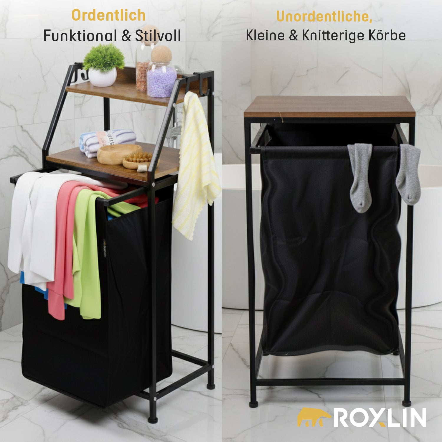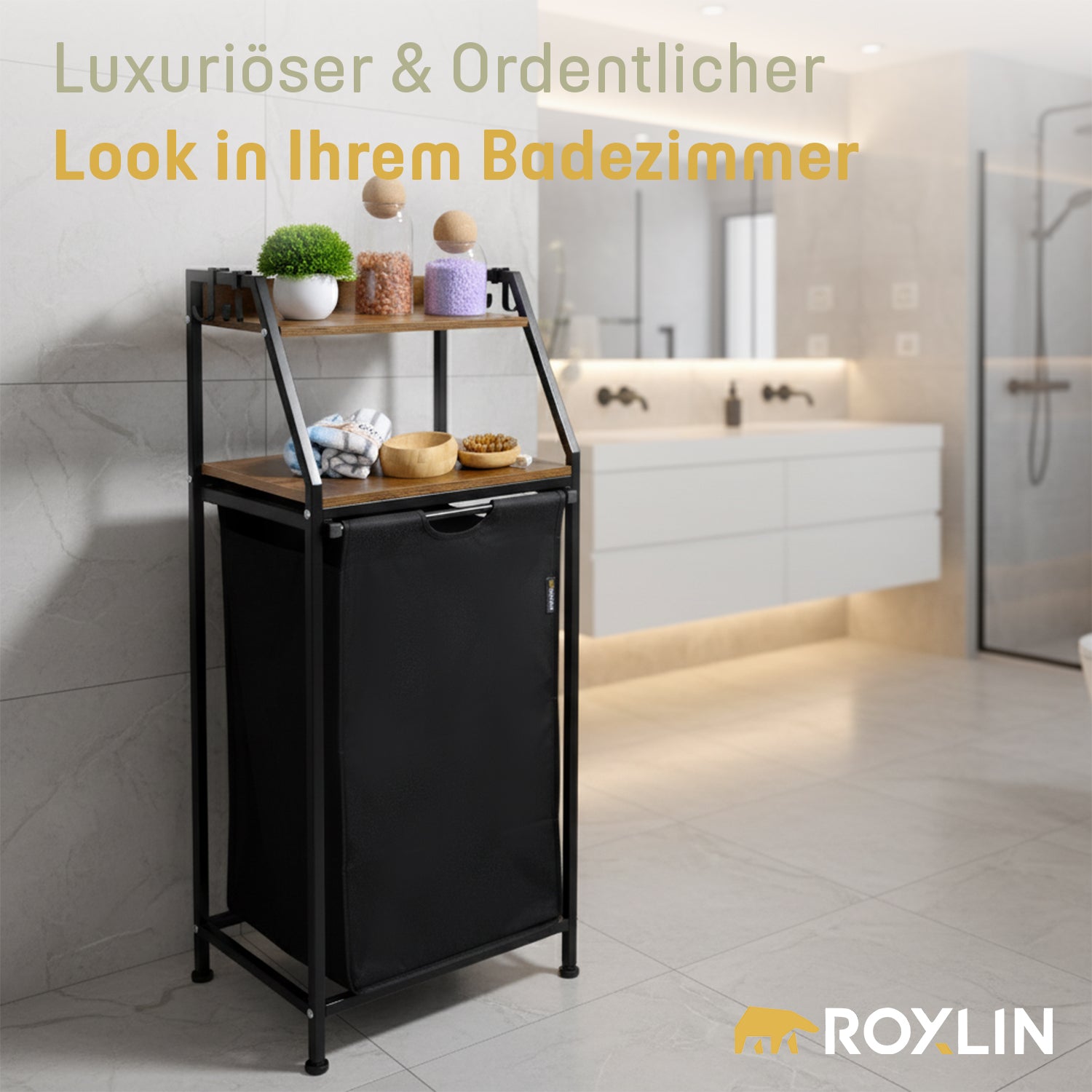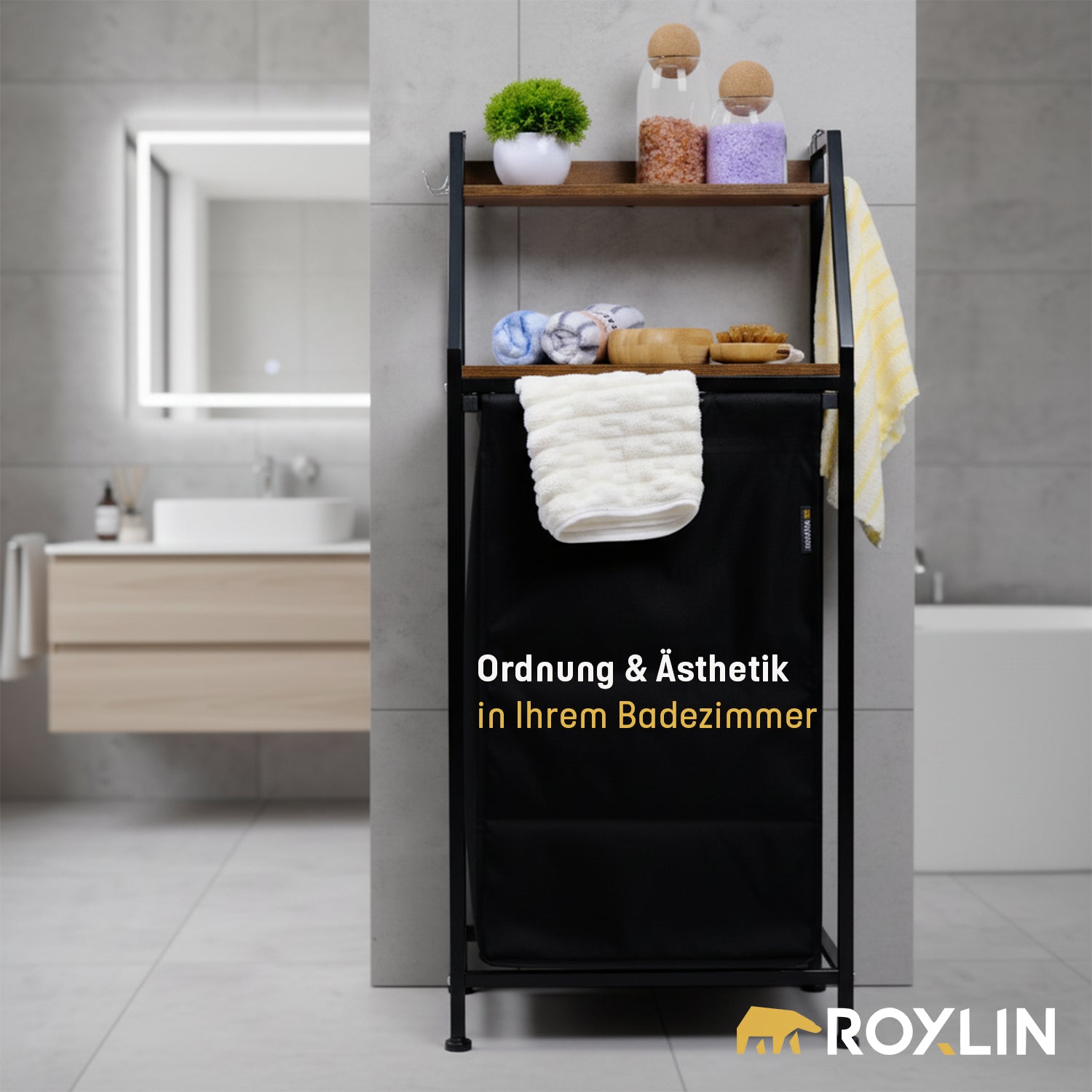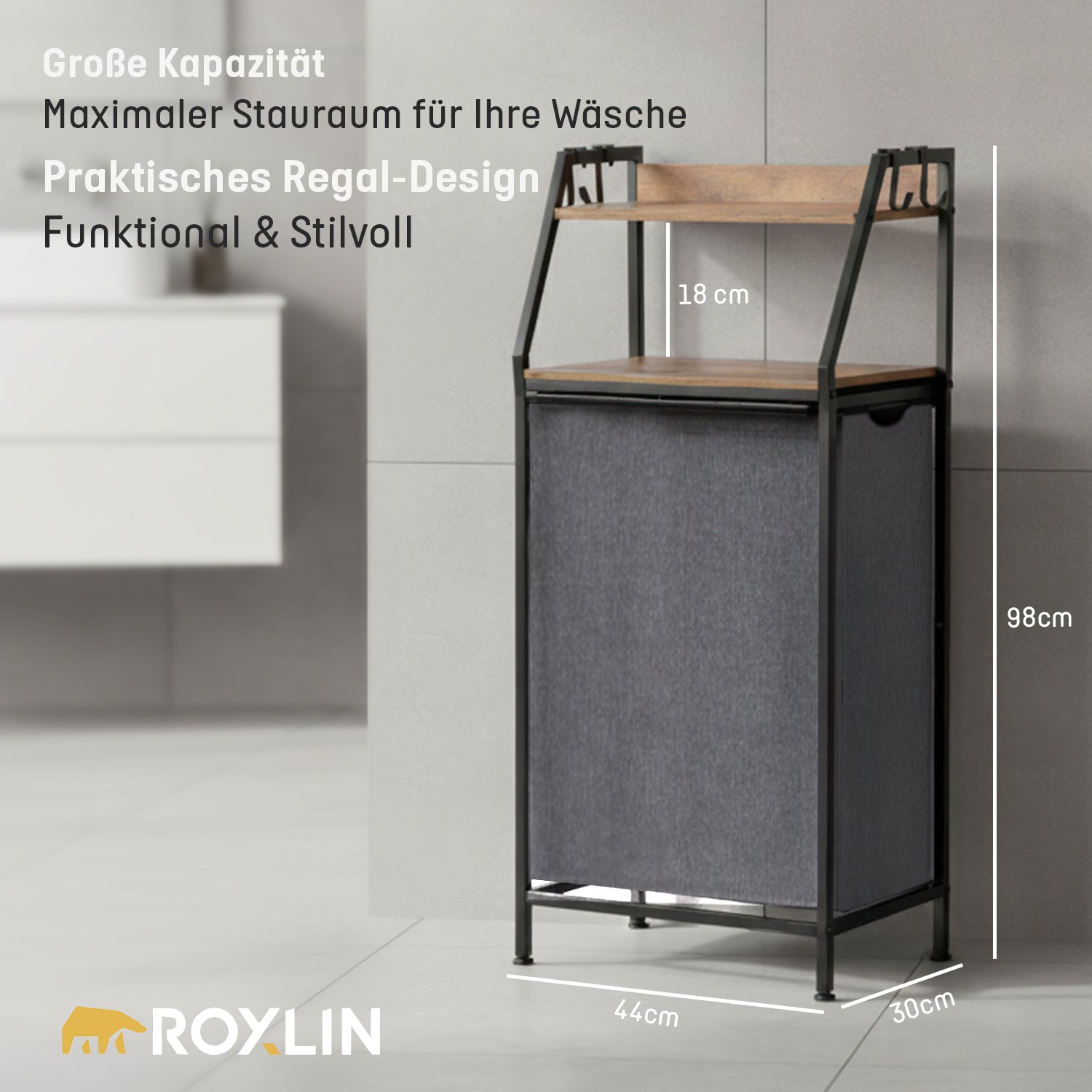 Der ROXLIN Wäschekorb mit Regal kombiniert modernes Design mit maximaler Funktionalität.