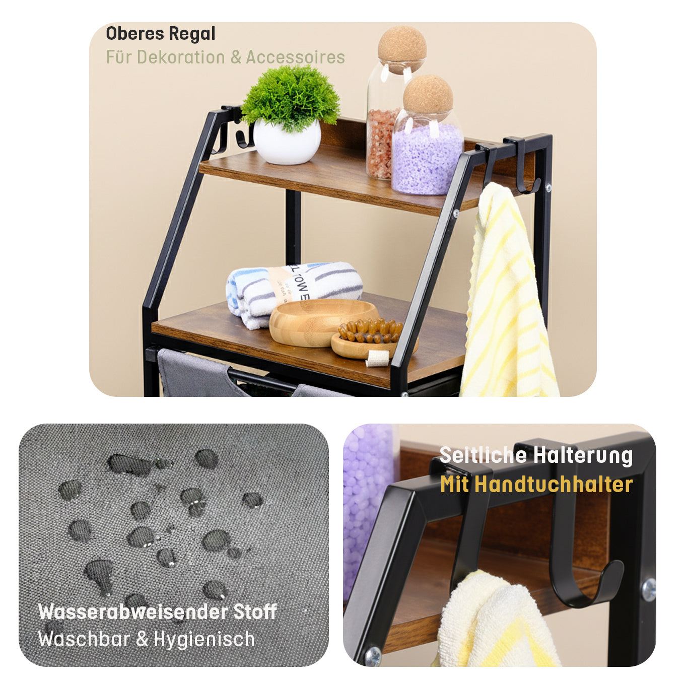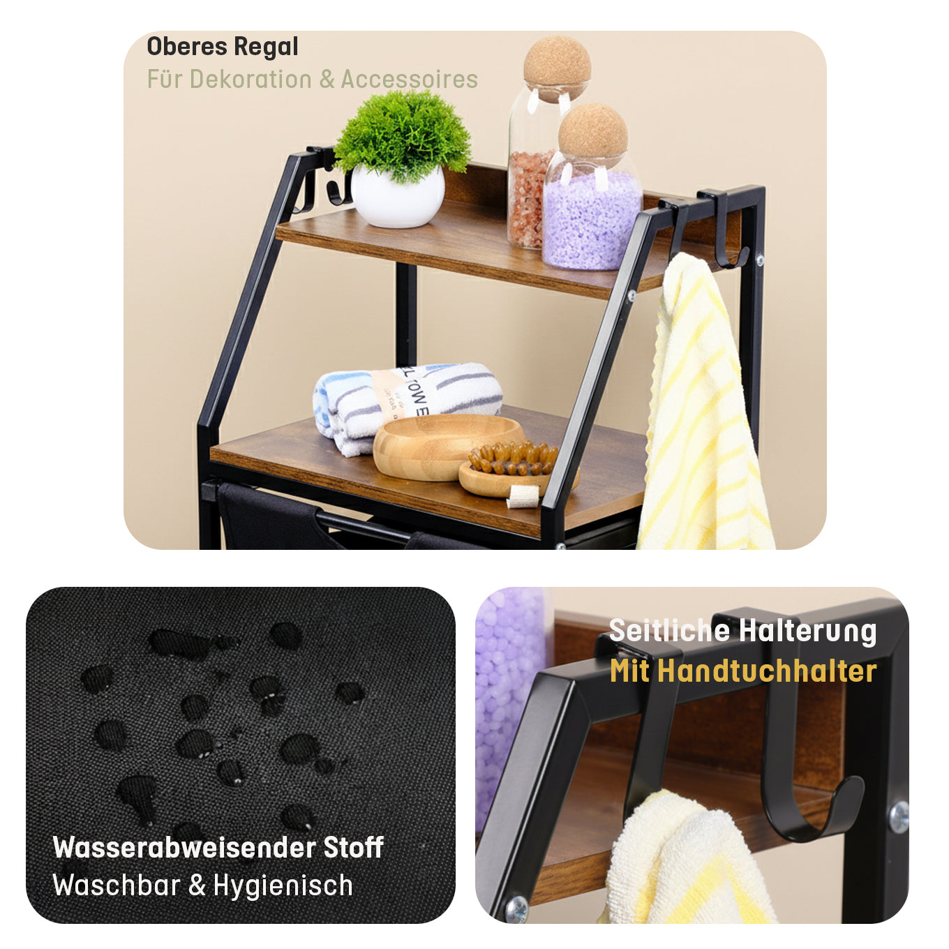 Der wasserabweisende Stoffkorb ist hygienisch, waschbar und leicht herausnehmbar. Der stabile Metallrahmen garantiert Langlebigkeit und sicheren Stand, während der seitliche Handtuchhalter zusätzlichen Komfort bietet.